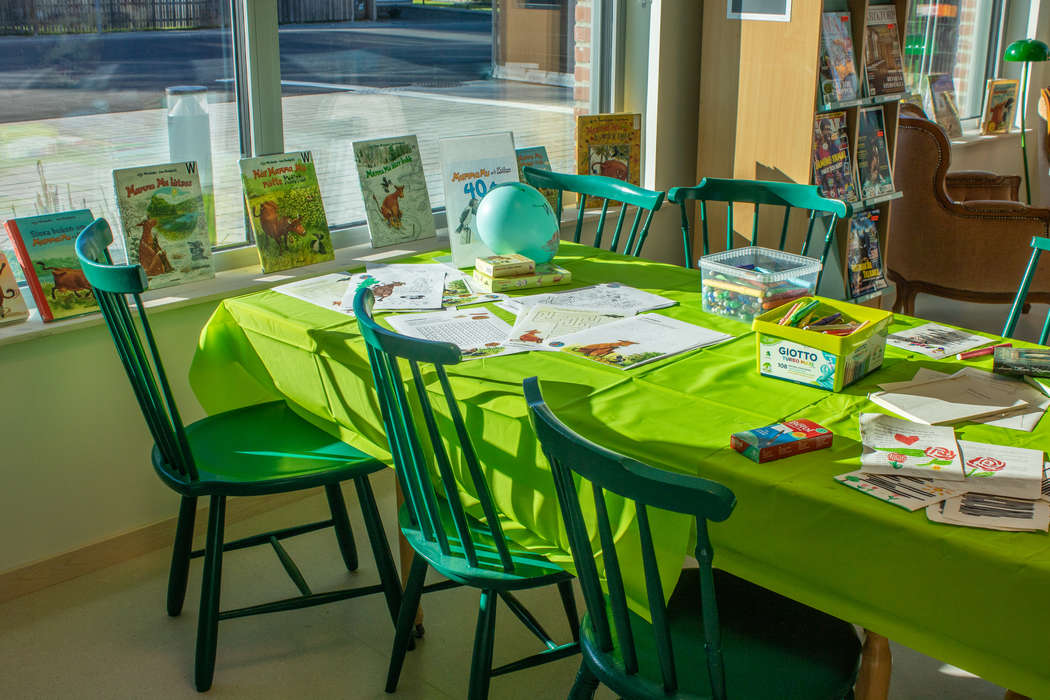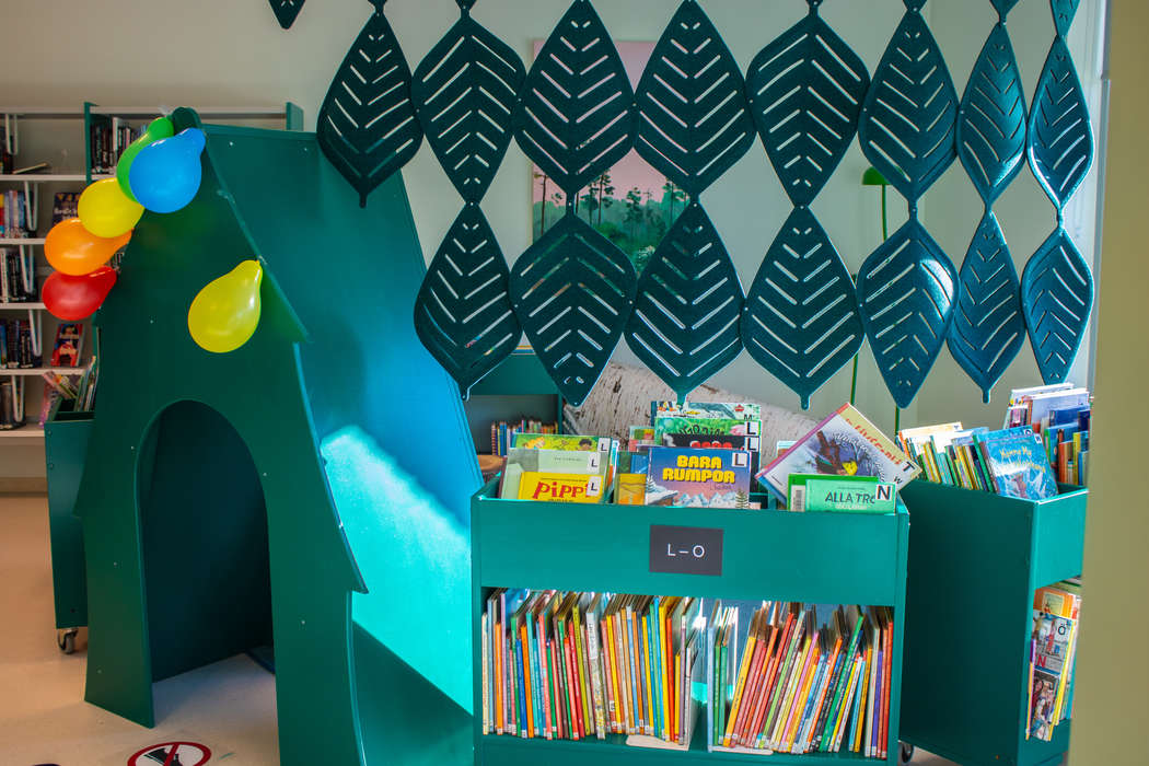 I de nya lokalerna har barnen fått en egen plats. Här finns bilderböcker samlade, mjuka mattor för små barn att krypa på och en portal i form av en gran som leder in till skogen.