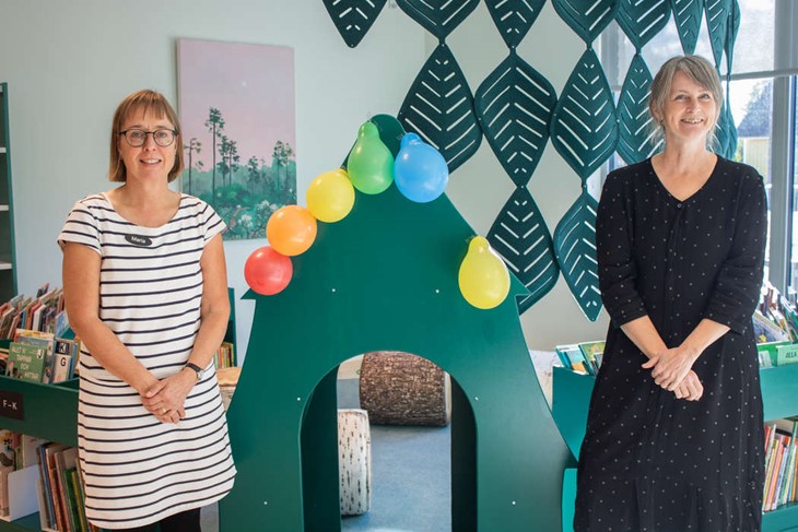 Maria Lundqvist är bibliotekarie i Grimslöv, här tillsammans med Kristina Folkesson som är bibliotekschef i Alvesta kommun utanför den nya barnhörnan. Foto: Josefin Petersson