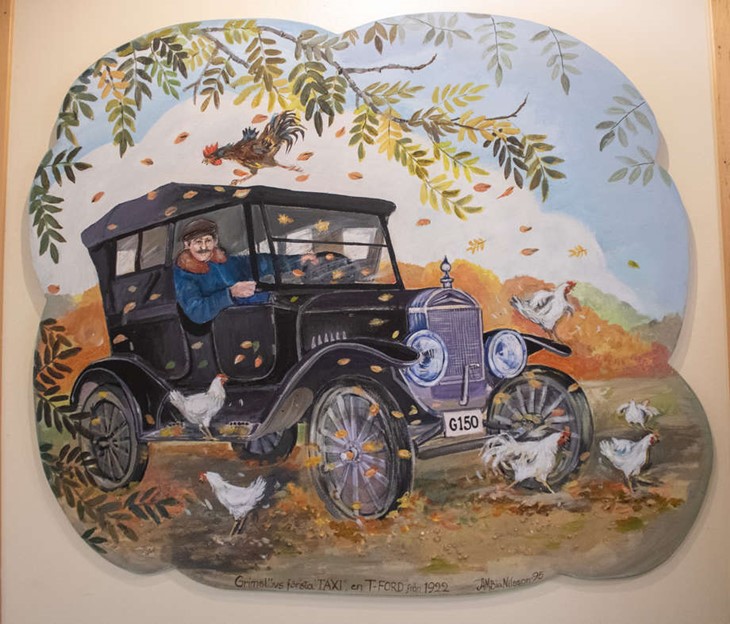 På väggarna hänger fortfarande konstnären Anne-Marie ”Bia” Nilssons tavlor, målade redan vid invigningen för trettio år sedan. Här på bild är Grimslövs första taxi, en T-Ford från 1922. Foto: Josefin Petersson