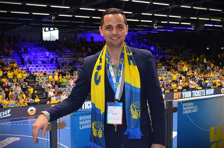 Craft Arena badade i blågult när Sverige vann över Litauen med 39–18 i EM-kvalavslutningen. På plats fanns Emil A Jansson, destinationschef för Kosta, som hejade fram damerna. Foto: Cornelia Nilsson