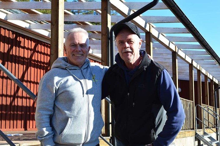 Leif Rydell och Anders Björehag har varit drivande i arbetet med den nya idrottsanläggningen i Skruv. Nu när rivningen startar hoppas de att satsningen ska bidra till utveckling och framtidstro i bygden. Foto: Cornelia Nilsson