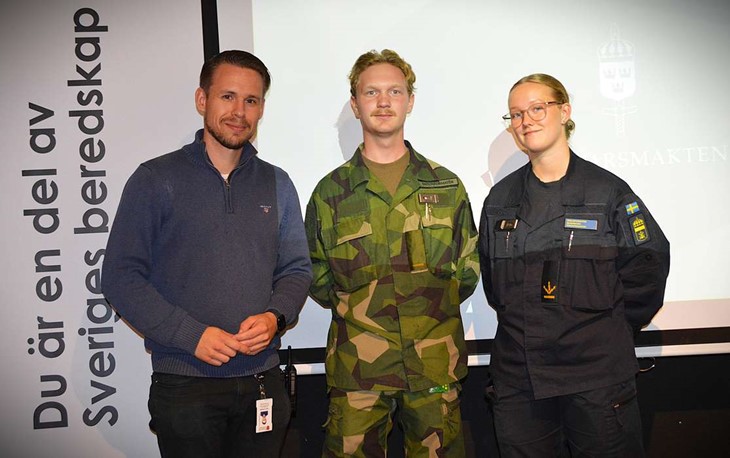 Smedin, beredskaps- och säkerhetssamordnare i Tingsryds kommun tillsammans med Karl Lindsten och Freja Haraldsson som föreläste för eleverna i årskurs två på Wasaskolan under beredskapsveckan. Foto: Cornelia Nilsson