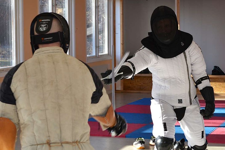 Efter bara några minuters sparring hörs ansträngda andetag. Det som kan se lekfullt ut kräver både styrka och uthållighet. För den som provar själv kommer mjölksyran snabbt i armen som håller svärdet.