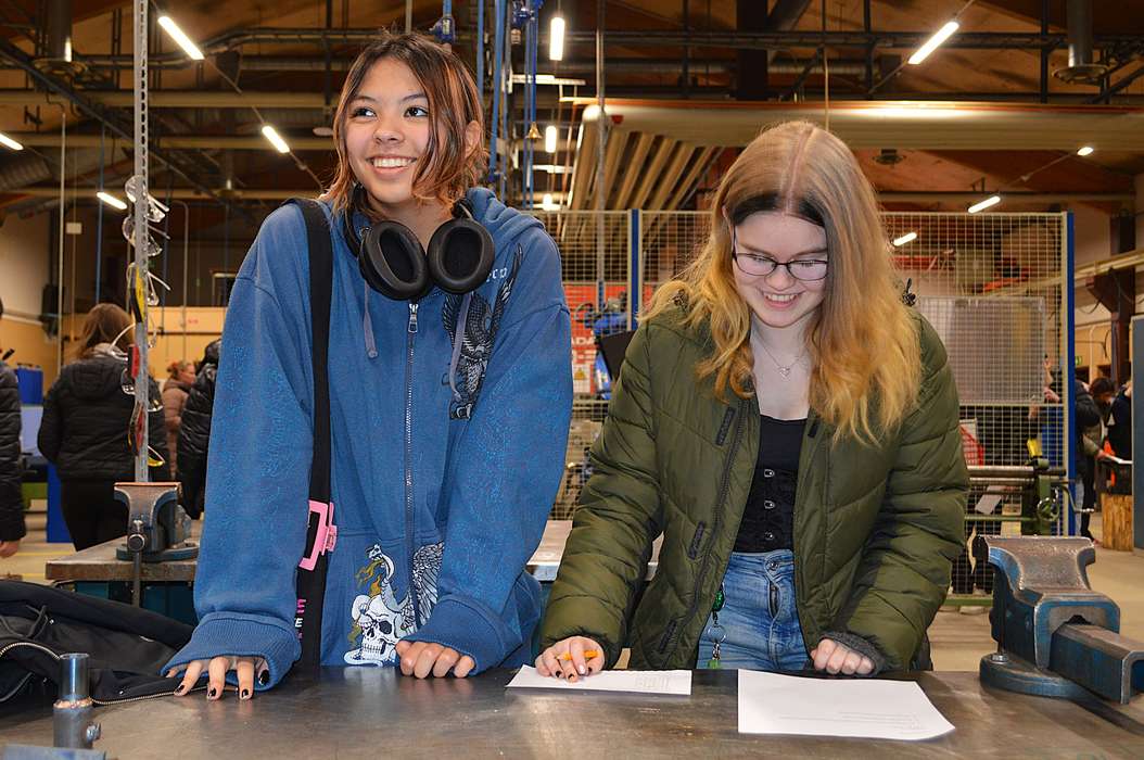Ida Gustavsson och Sina Golzheim från Dackeskolan testar praktiska moment på Wasaskolan under heldagen ”Detta är också teknik”, där målet är att ge en bredare bild av tekniska yrken. Foto: Cornelia NIlsson