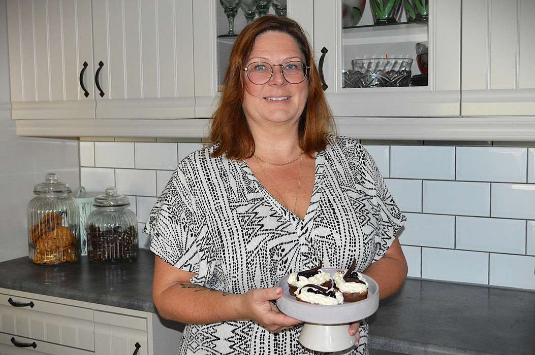 Idag, 53 år gammal, fyller hon sitt kök med allt från småkakor till avancerade figurtårtor på beställning. På köksbordet står en italiensk mandel och citronkaka som är doppad i blåbärschokladtryffel med lemoncurd och blåbär på, ett av hennes senaste experiment.