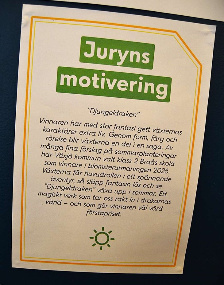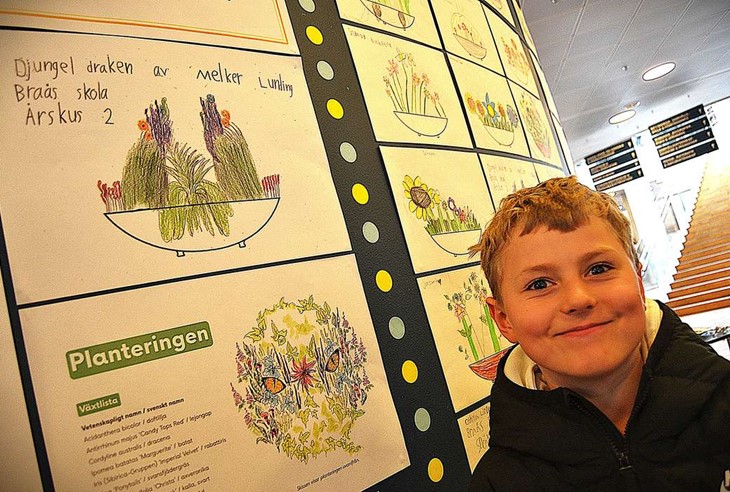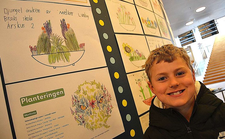Det är teckningar från en tävling som visas där elever i årskurs 2 bidragit med idéer till sommarens blomsterplanteringar i Växjö kommun.