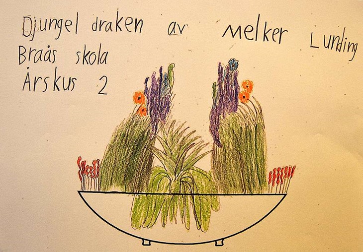 - Jag läste en bok en morgon innan skolan där en drake var med. Så sedan när vi skulle göra en teckning blev det med en drake som planta.