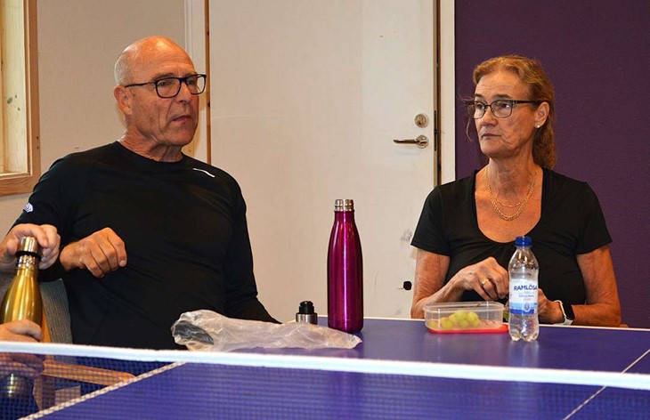 Åke Sjöberg och Elisabeth Hermansson sitter och njuter av fikan efter 45 minuters pingisträning. Efter fikan spelar de en timme till. Foto: Cornelia Nilsson