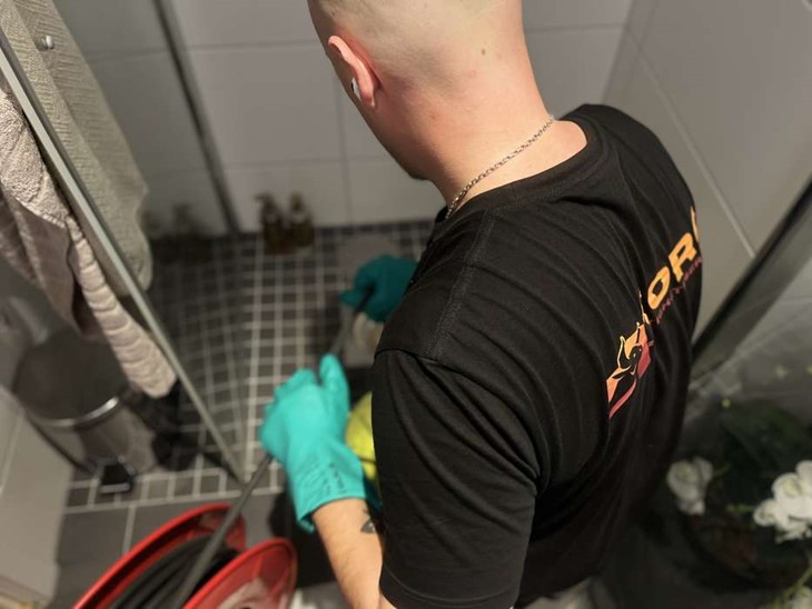 - Man underhållsspolar för att förhindra att det blir stopp i rören med fett och beläggning. Så vi spolade under köksvaskarna och i golvbrunnarna i badrummen.
