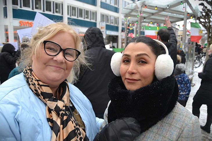Pernilla Wikelund och Sara Iranshahi i SD höll tal. - Problemet i Iran är islam, anser de. Foto: Hans Nilsson