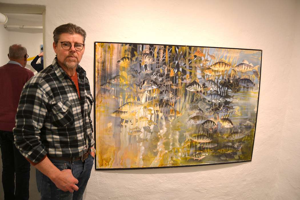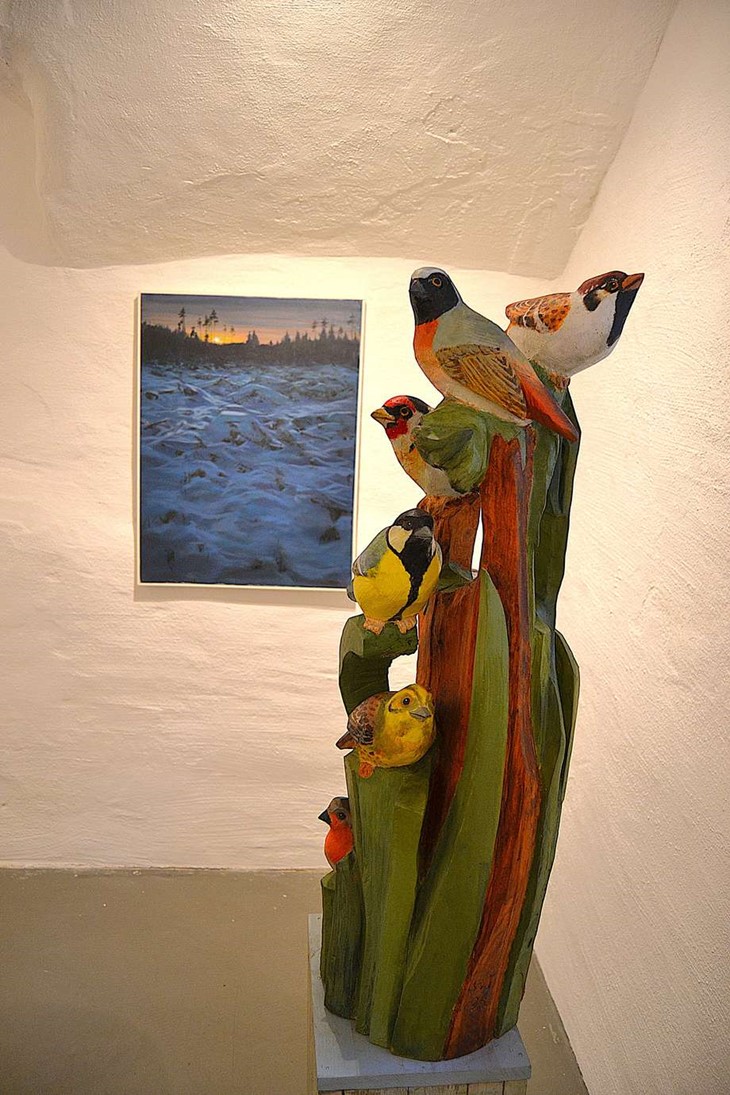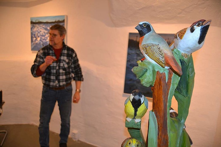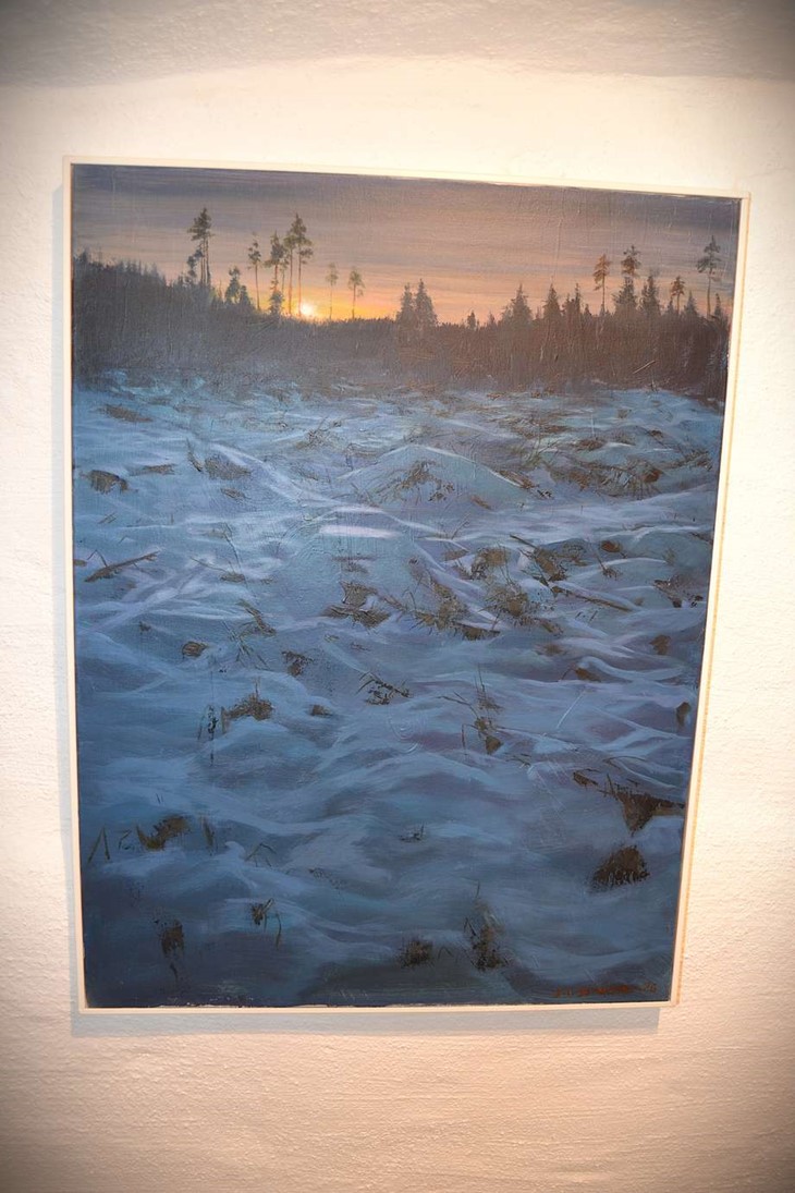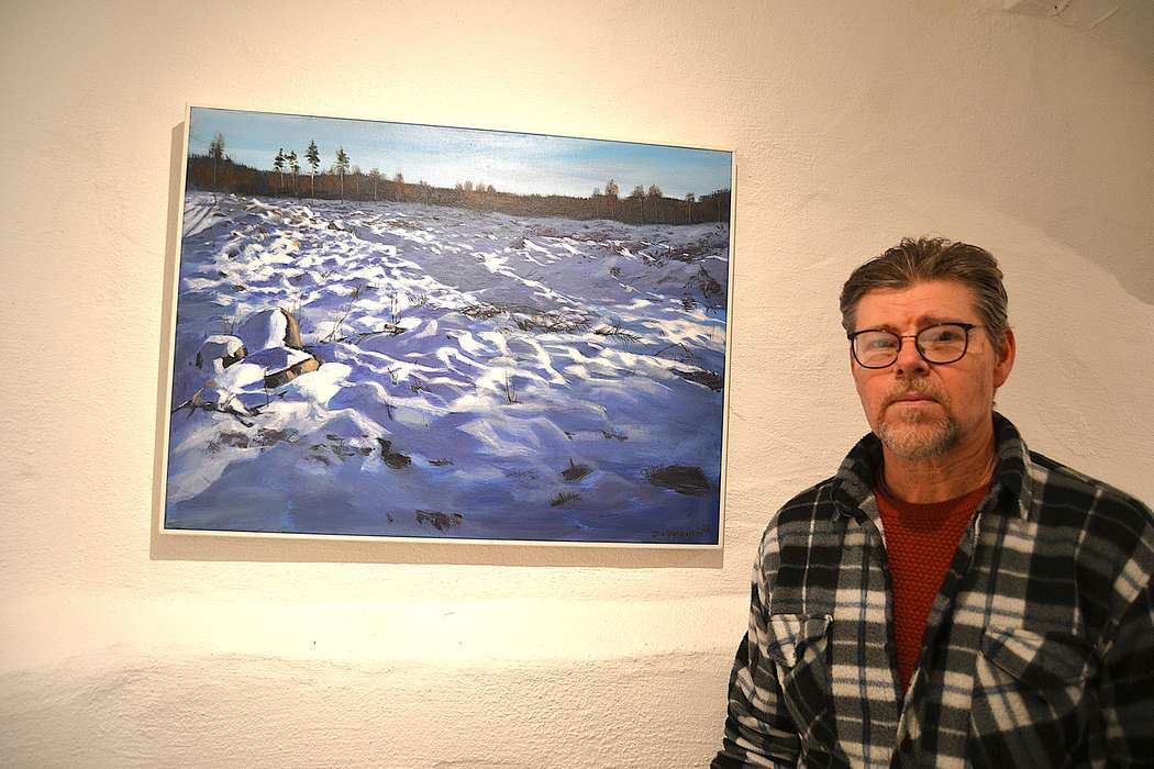 På Sigma ställer han nu ut målningar i blandteknik, akryl och akvarell och skulpturer i polyester och ståltråd och trä till den 14 februari. Målningarna är otroligt stämningsfulla och finstämda skildringar av natur- och djurmotiv från hans gamla hemtrakter i Göteryd.