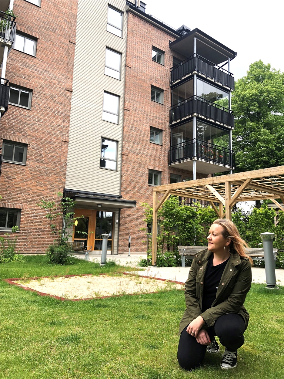 Här i kvarteret Saturnus på Väster har Växjöbostäder 39 lägenheter. 24 juli plockar Folkdivizjon upp sina instrument på gården. På bild Anna Fäldt, som stått för hela projektet. Foto: Thomas Edgren