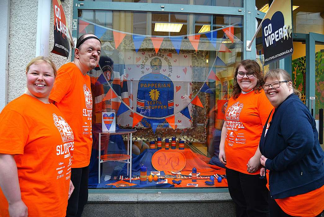 VÄXJÖ. Papperian på Klostergatan var nära att vinna Växjö Lakers tävling ”Slutspelets snyggaste skyltfönster i Växjö”.
