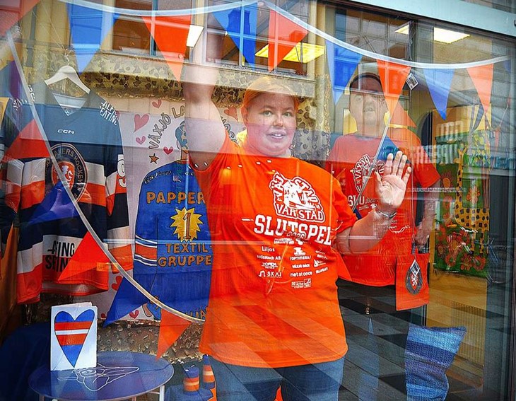 Redan efter ett par dagar kunde Papperian fylla skyltfönstret på Klostergatan 11 med Växjö Lakers-dekorering.